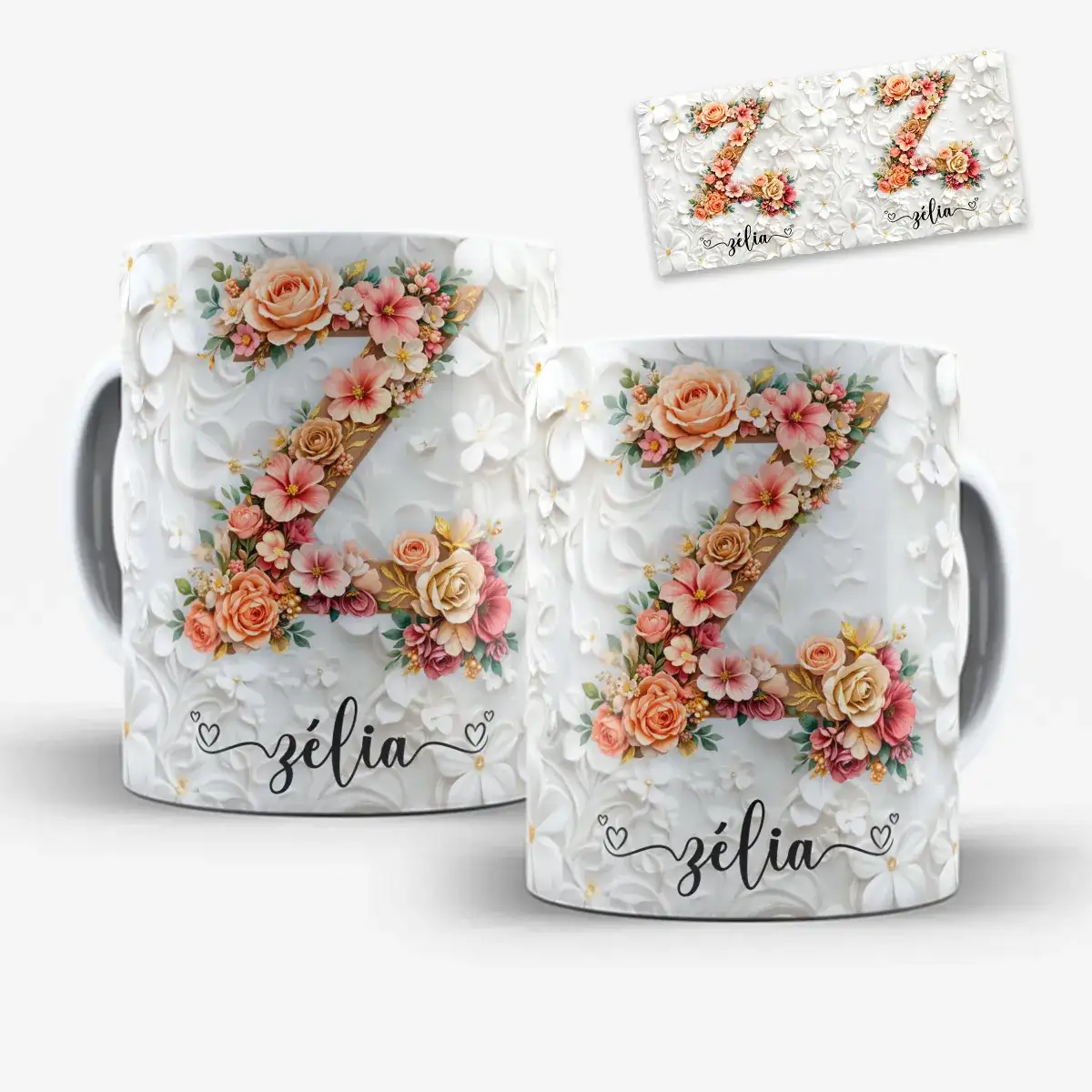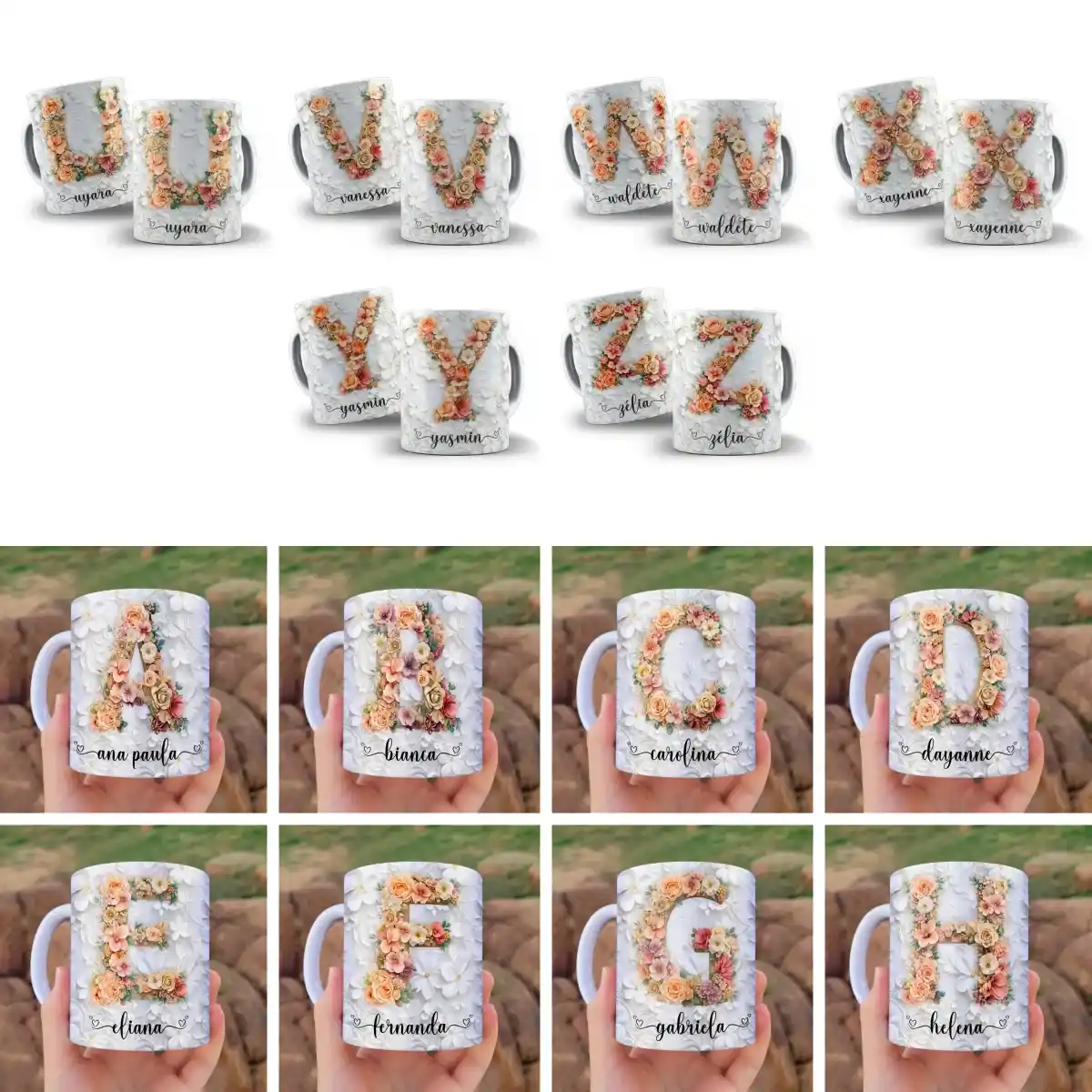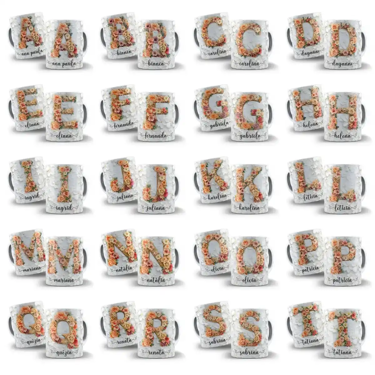 A arte para caneca alfabeto floral com inicial 3d foi desenvolvida com foco em estética e conversão. As letras são compostas por flores em tons suaves como pêssego, rosa e bege, criando uma identidade visual leve e elegante.