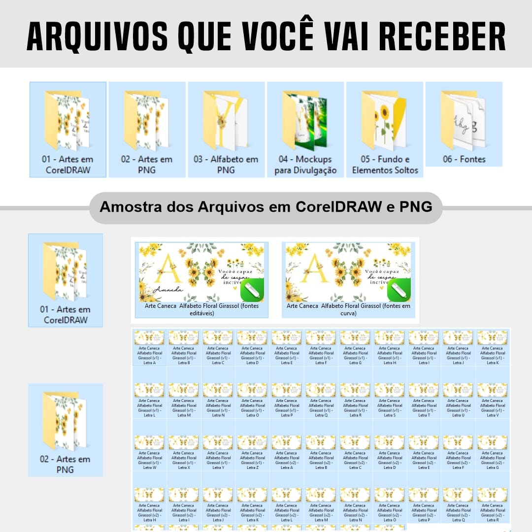 Ter a arte para caneca alfabeto floral girassol organizada em arquivos prontos acelera seu fluxo de trabalho. Você reduz tempo de criação, evita retrabalho e mantém padrão visual consistente em todas as encomendas.