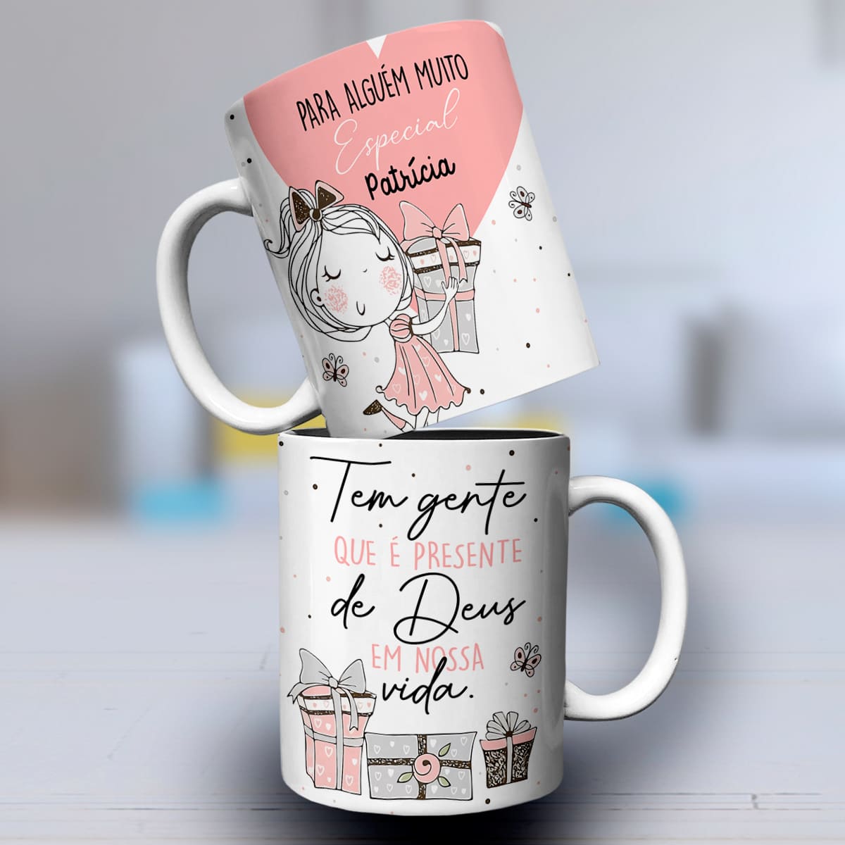 Com um design delicado que transmite carinho genuíno, essa arte traz uma menininha fofa segurando um presente, a frase “Tem gente que é presente de Deus em nossa vida” e ainda permite personalizar com o nome da pessoa especial.