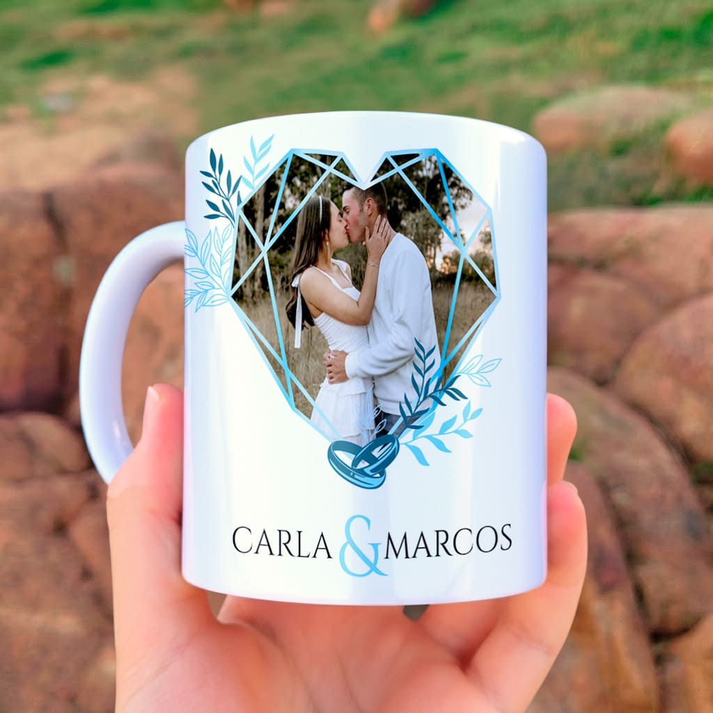 Com design sofisticado em dourado, espaço para foto do casal e personalização com nomes, ela entrega aquele diferencial que faz o cliente escolher a sua caneca ao invés de procurar em outro lugar.