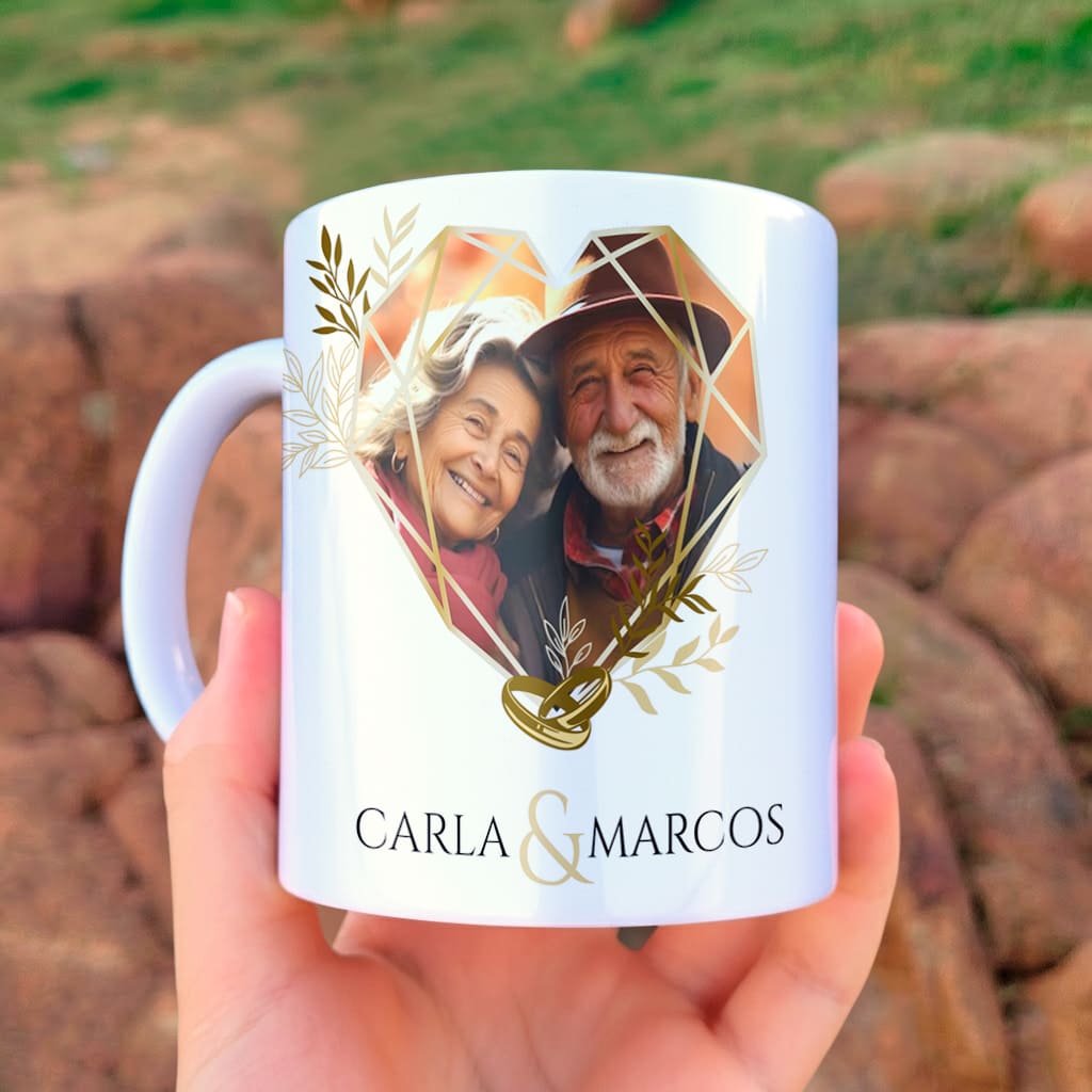 Com design sofisticado em dourado, espaço para foto do casal e personalização com nomes, ela entrega aquele diferencial que faz o cliente escolher a sua caneca ao invés de procurar em outro lugar.