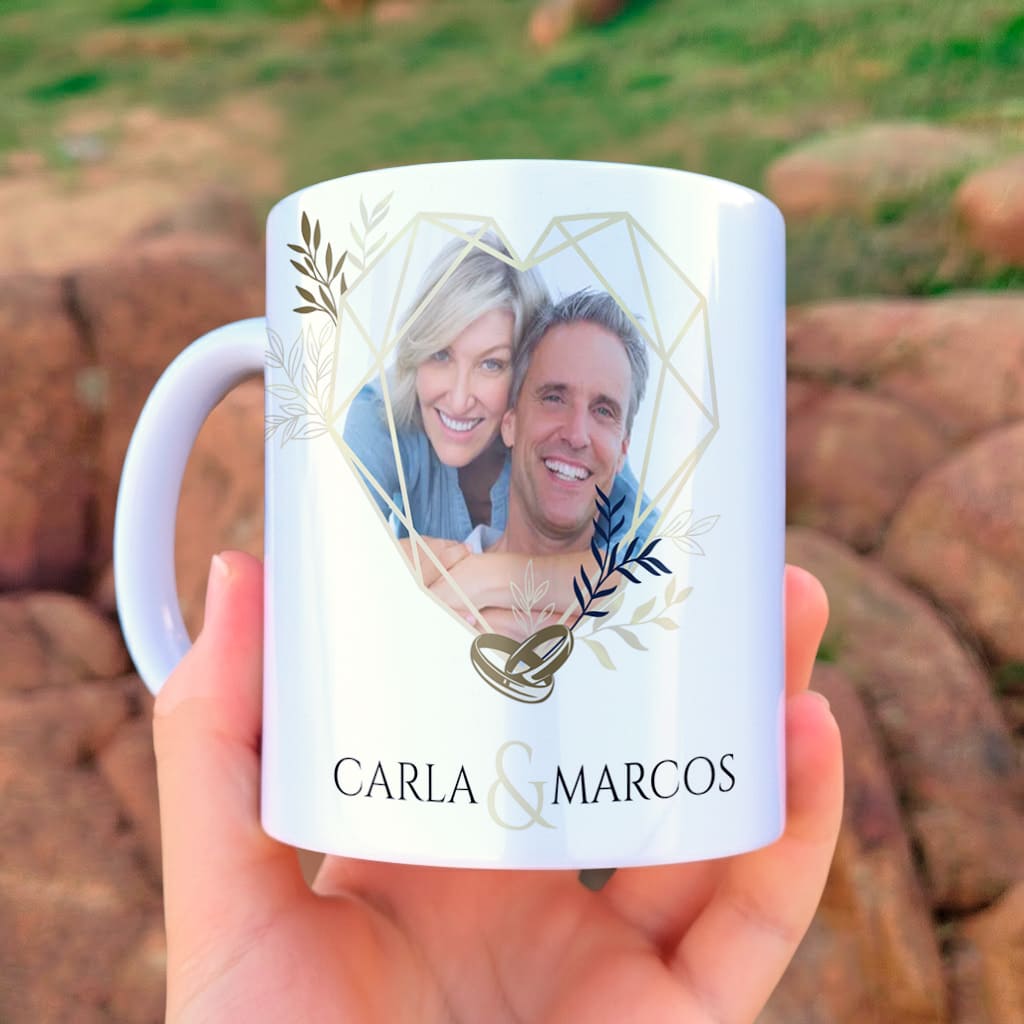 Com design sofisticado, espaço para foto do casal e personalização com nomes, ela entrega aquele diferencial que faz o cliente escolher a sua caneca ao invés de procurar em outro lugar.