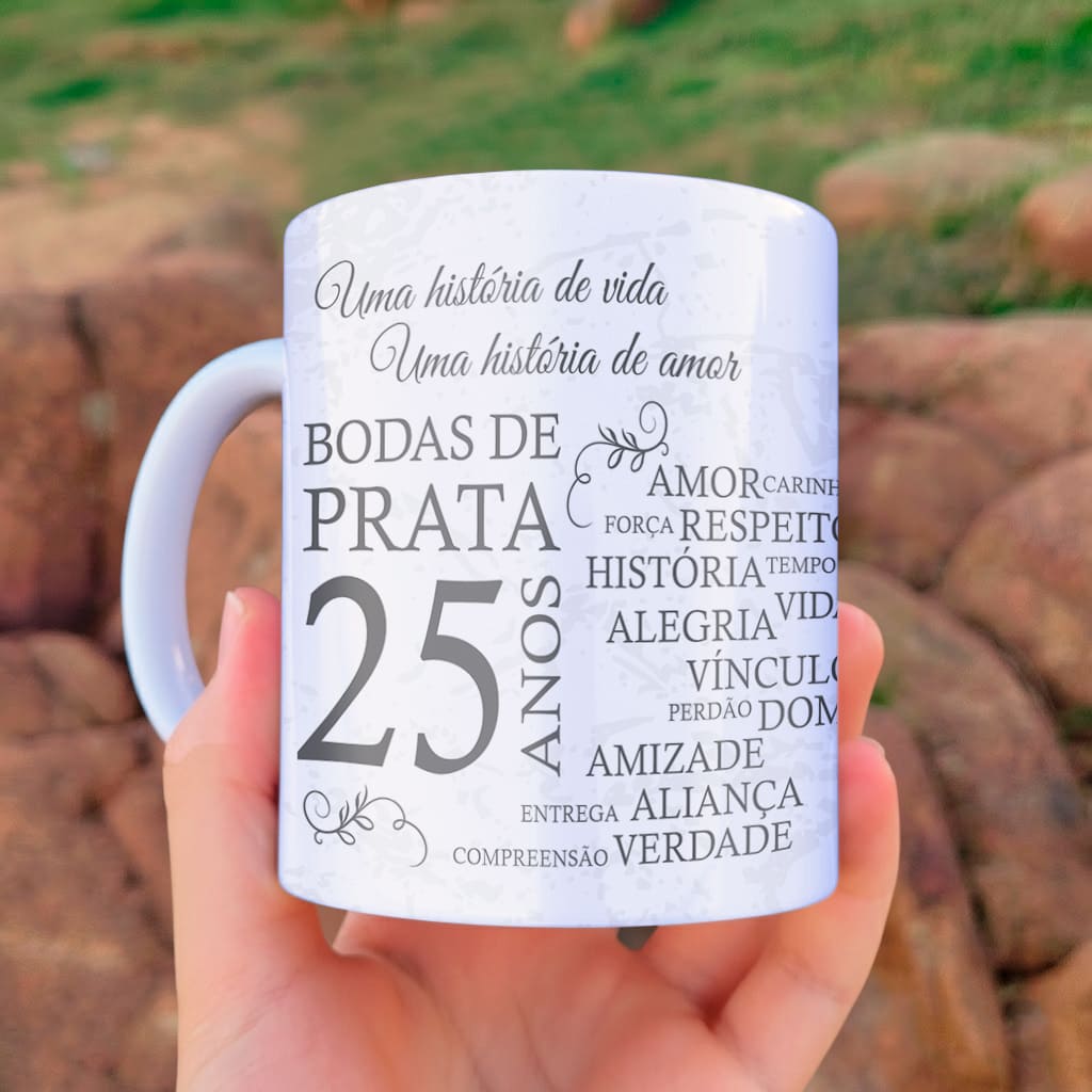 Garanta agora essa arte para caneca Bodas de Prata e ofereça aos seus clientes um presente à altura de 25 anos de amor e história.