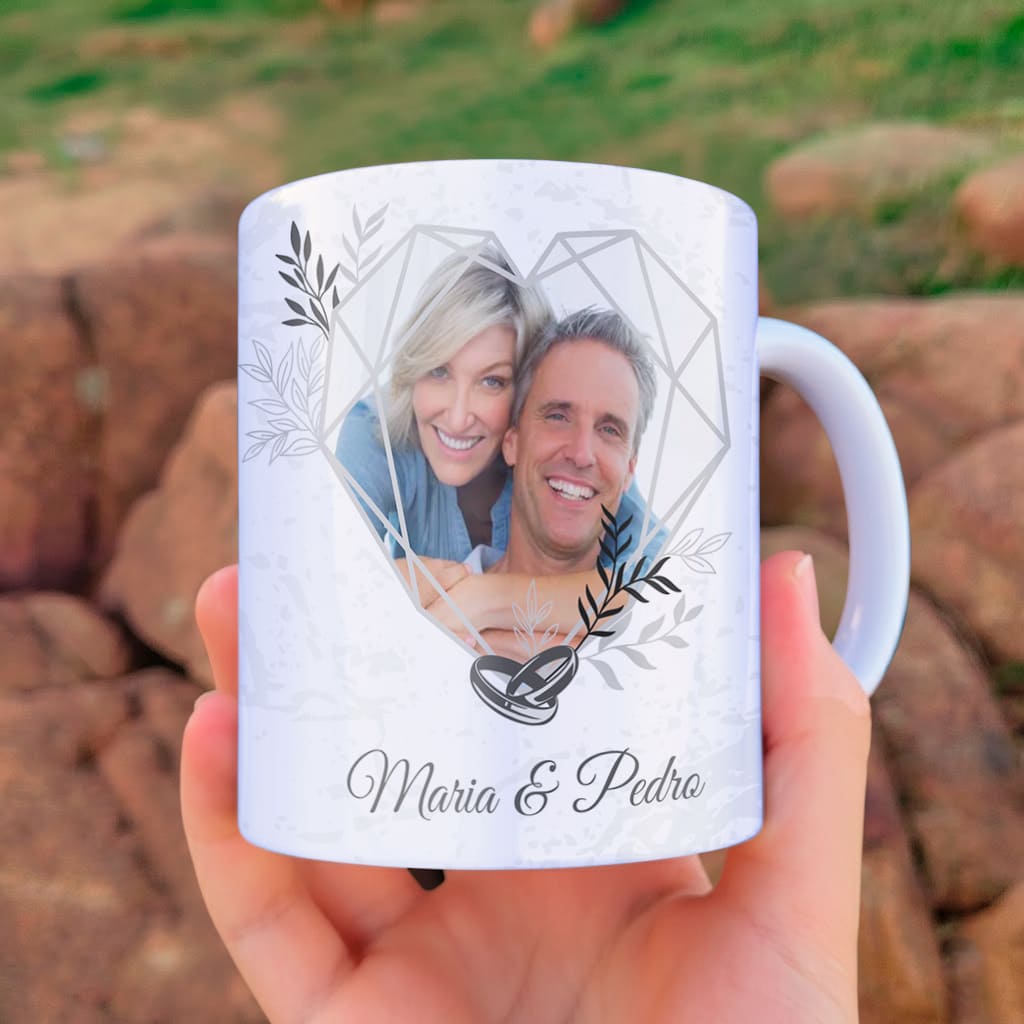 O espaço dedicado à foto e aos nomes do casal transforma uma simples caneca em uma verdadeira peça afetiva, elevando o valor percebido do produto e encantando o cliente final.
