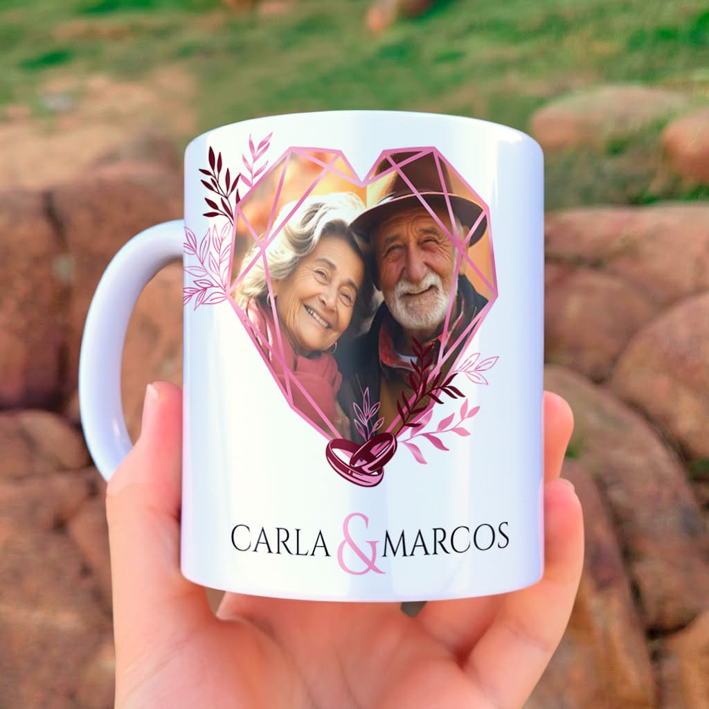 Com design sofisticado, espaço para foto do casal e personalização com nomes, ela entrega aquele diferencial que faz o cliente escolher a sua caneca ao invés de procurar em outro lugar.