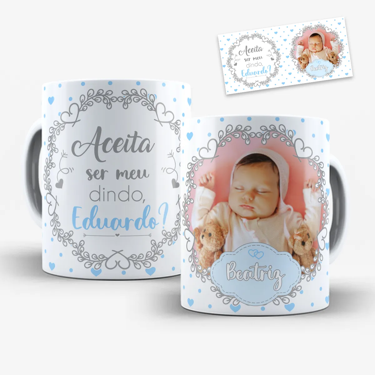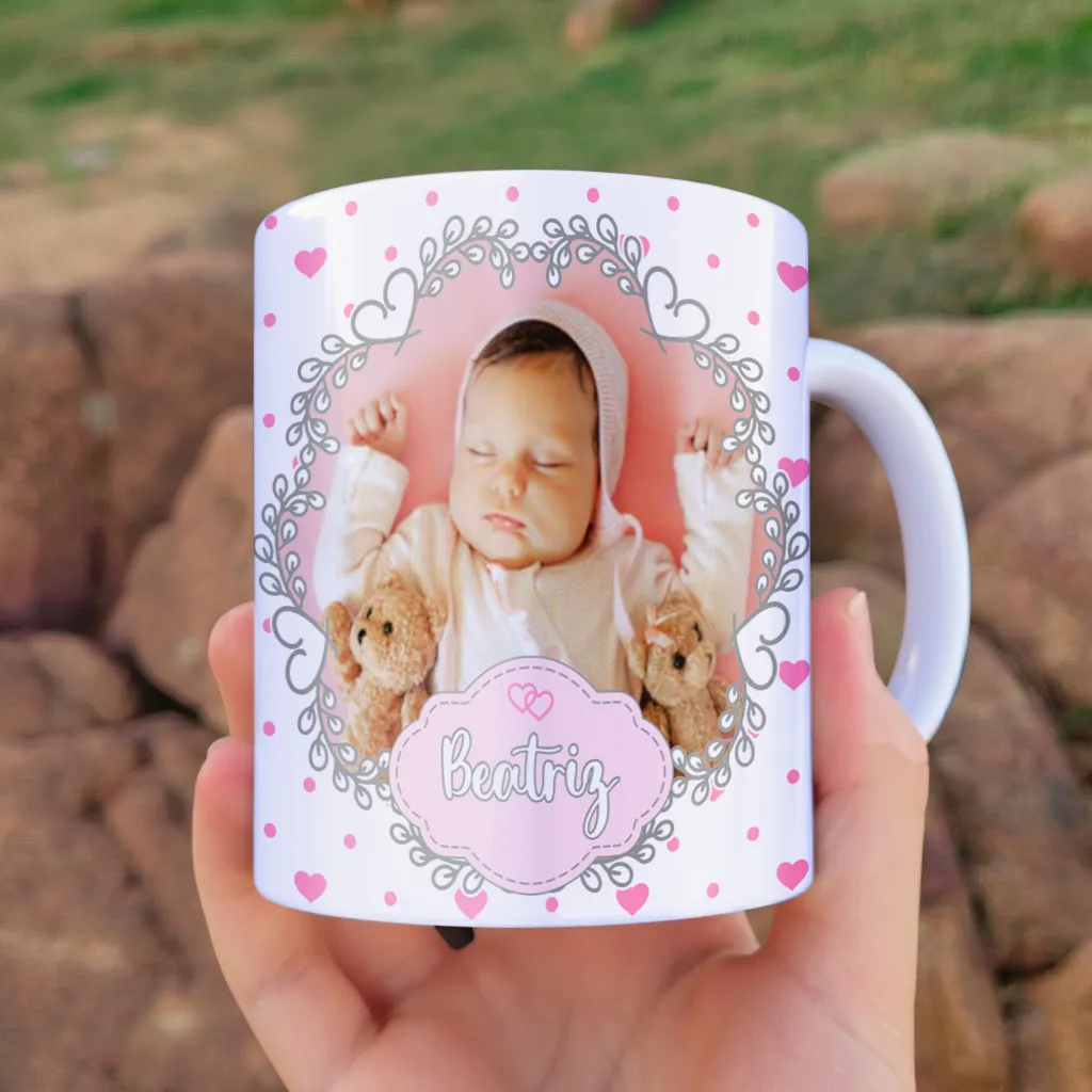 A arte para caneca convite dindo e dinda com nome e foto entrega exatamente isso: um layout delicado, com espaço para foto, nome da criança e nome dos padrinhos, criando um produto final único e altamente valorizado.