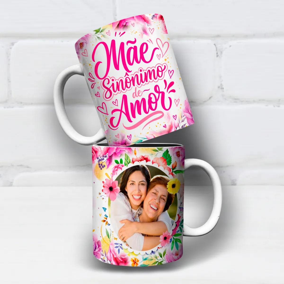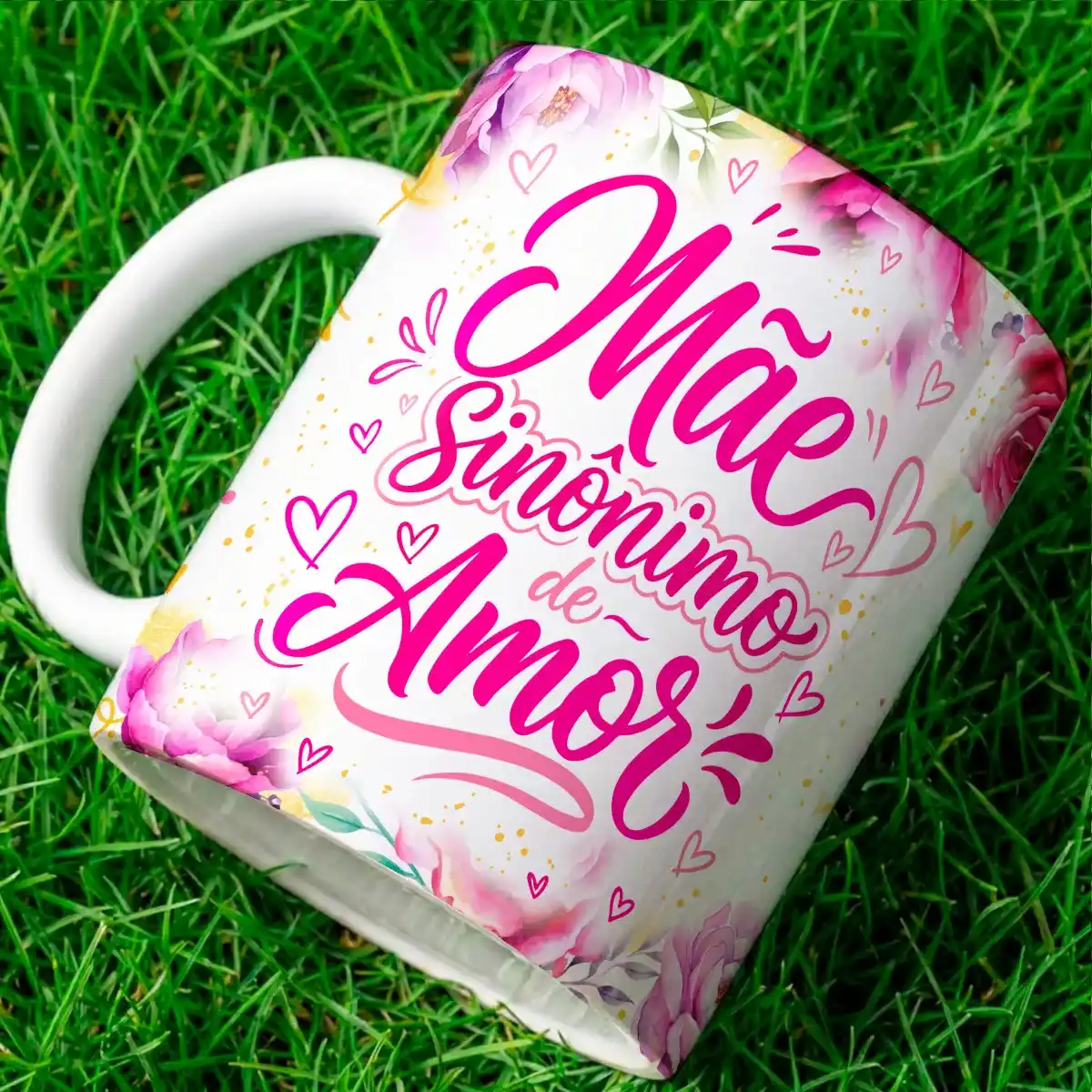 A arte para caneca dia das mães mãe sinônimo de amor foi cuidadosamente desenvolvida com foco em estética e emoção. O fundo floral em tons suaves transmite delicadeza, enquanto os pequenos corações reforçam a mensagem de carinho.