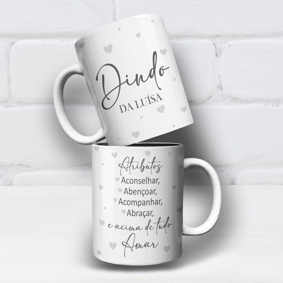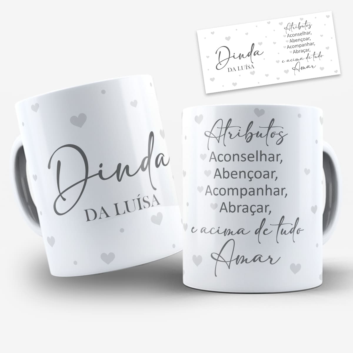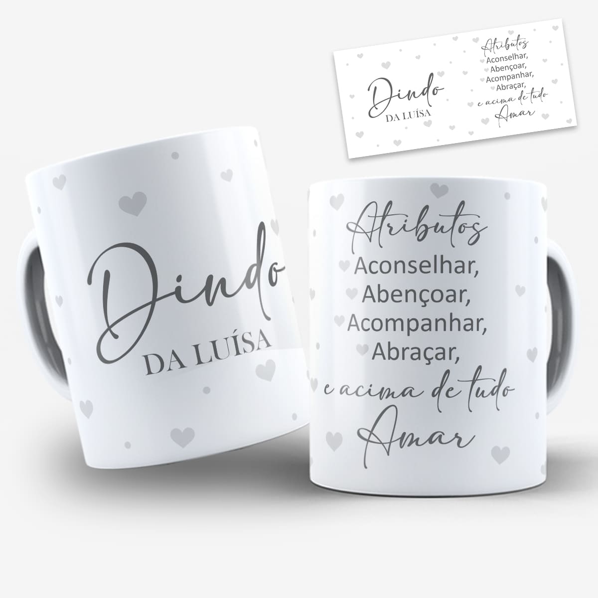 A arte para caneca dindo e dinda atributos complementa outras linhas de padrinhos, familiares e homenagens. Ela permite criar combos, kits personalizados e variações com nomes individuais.