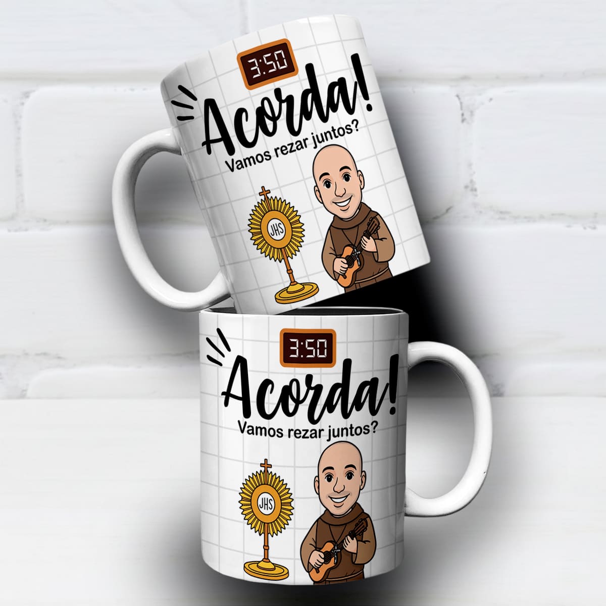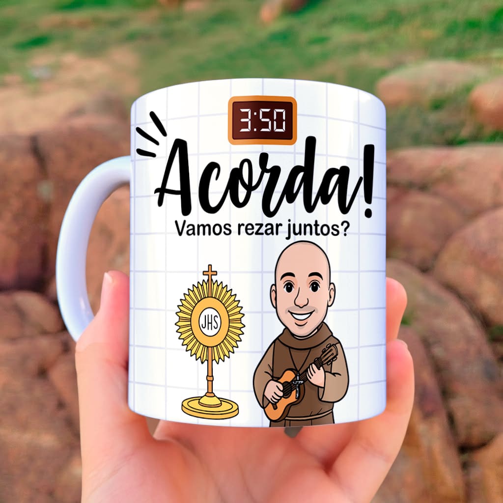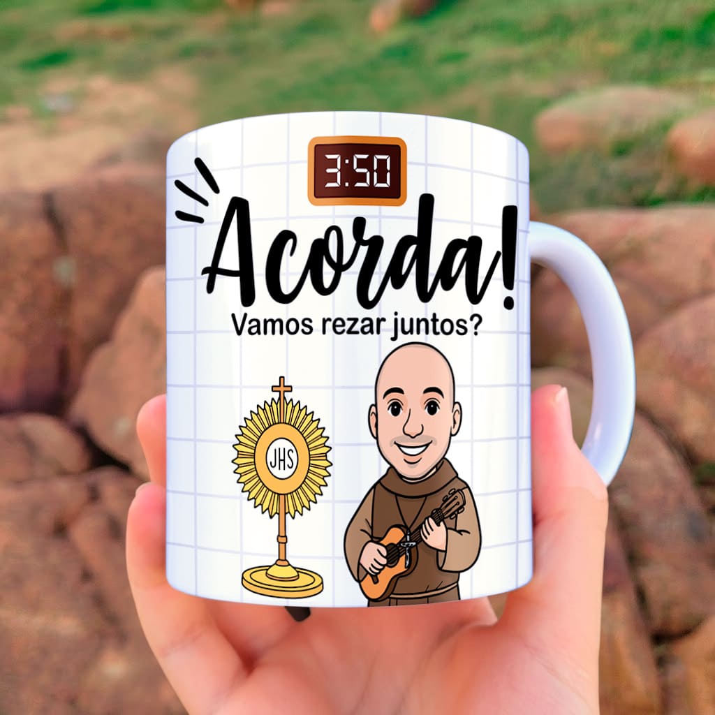 A arte para caneca Frei Gilson Vamos Rezar Juntos chega para preencher essa lacuna no seu portfólio.