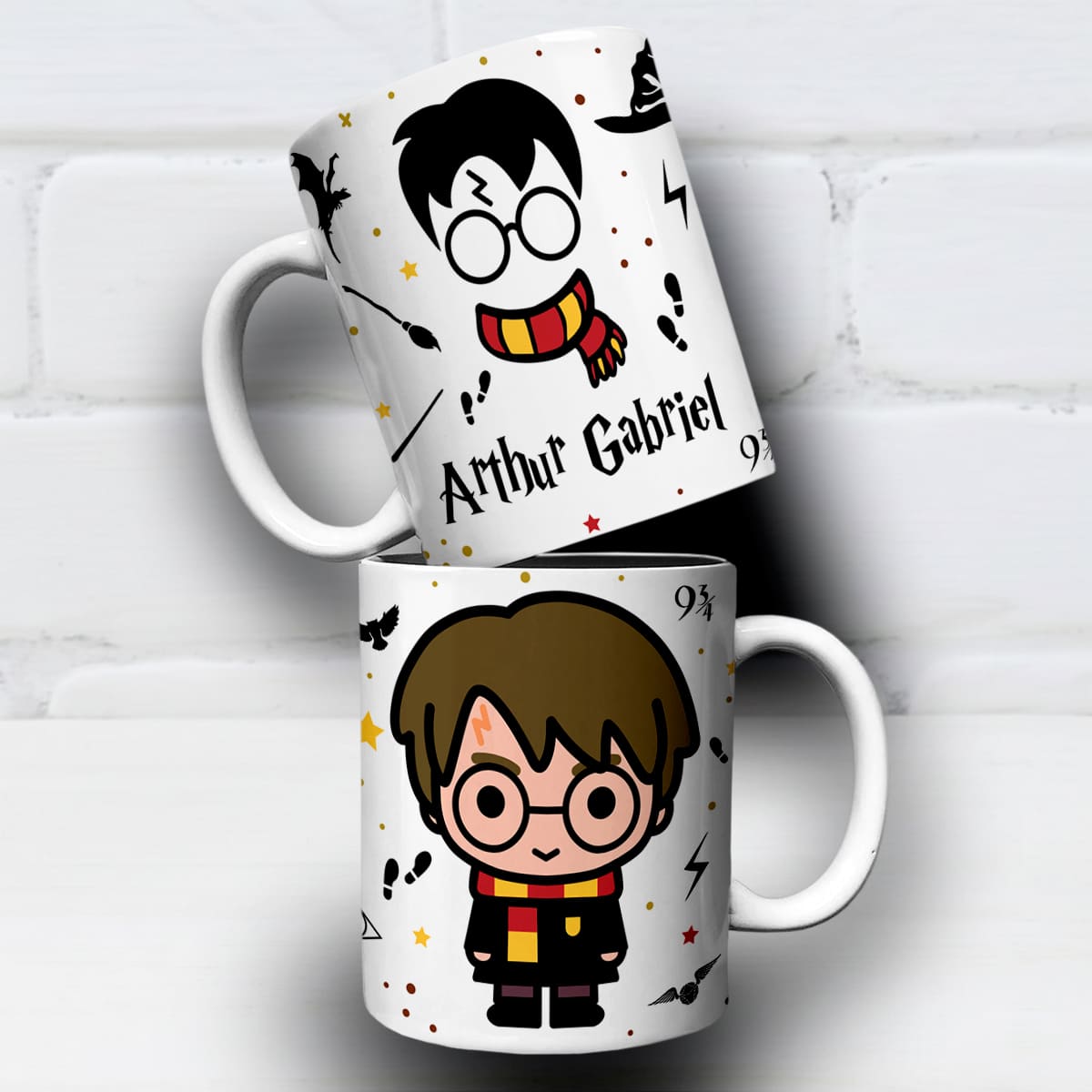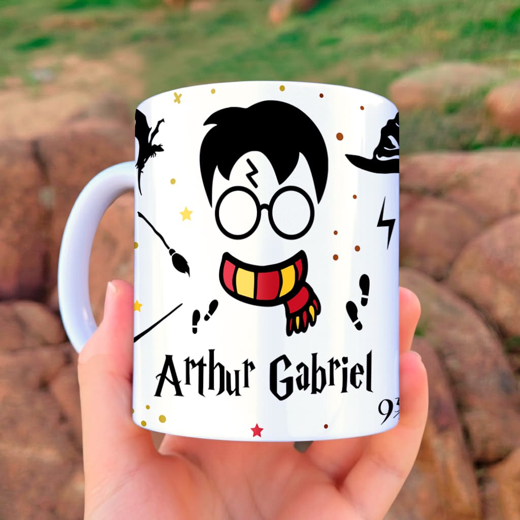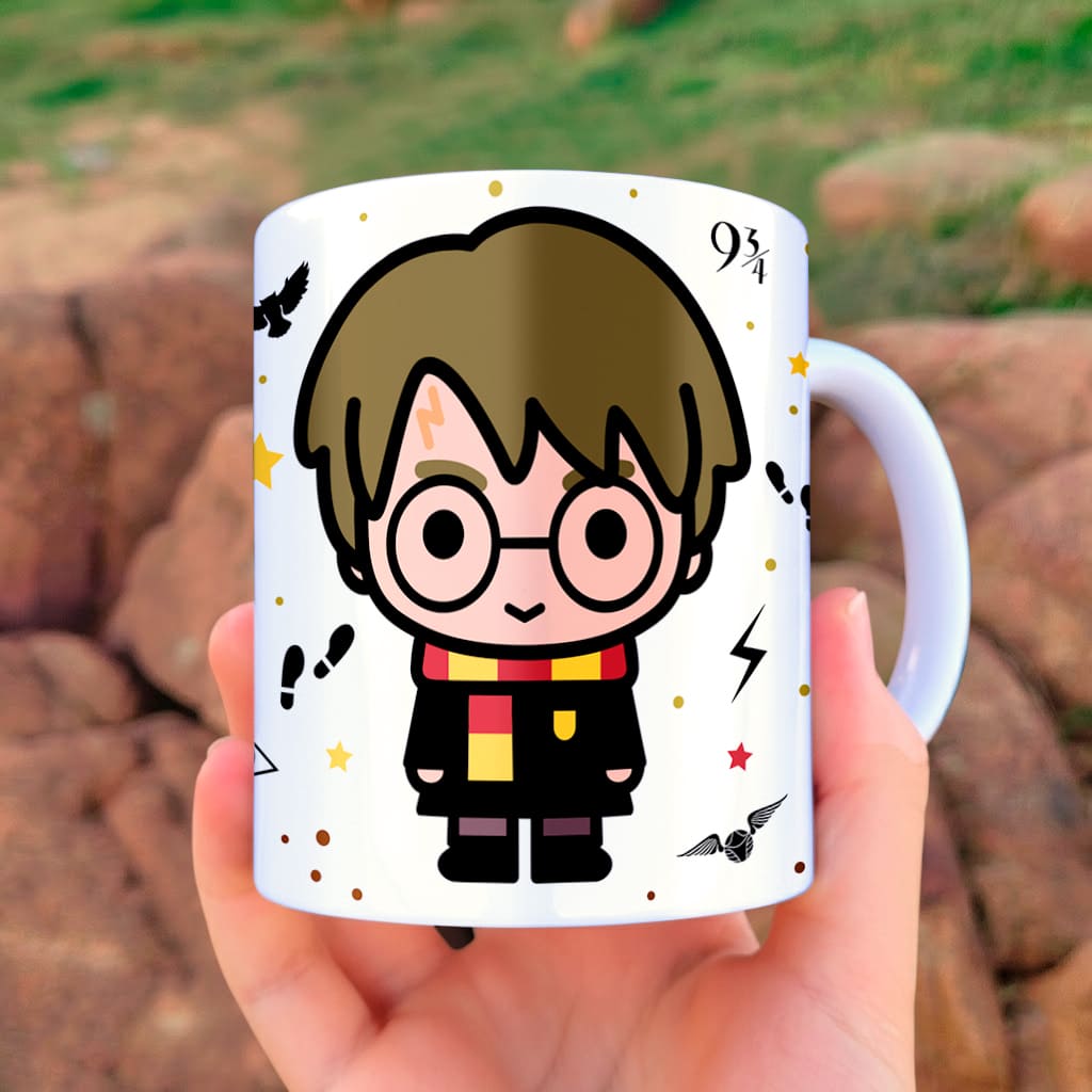 O visual encantador com óculos redondos, cicatriz de raio, cachecol grifinório e detalhes mágicos deixa a caneca irresistível.