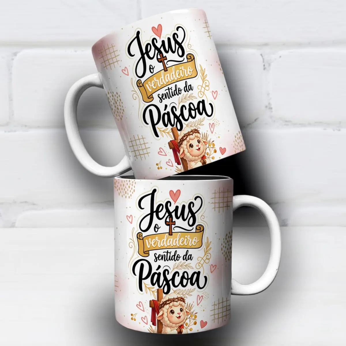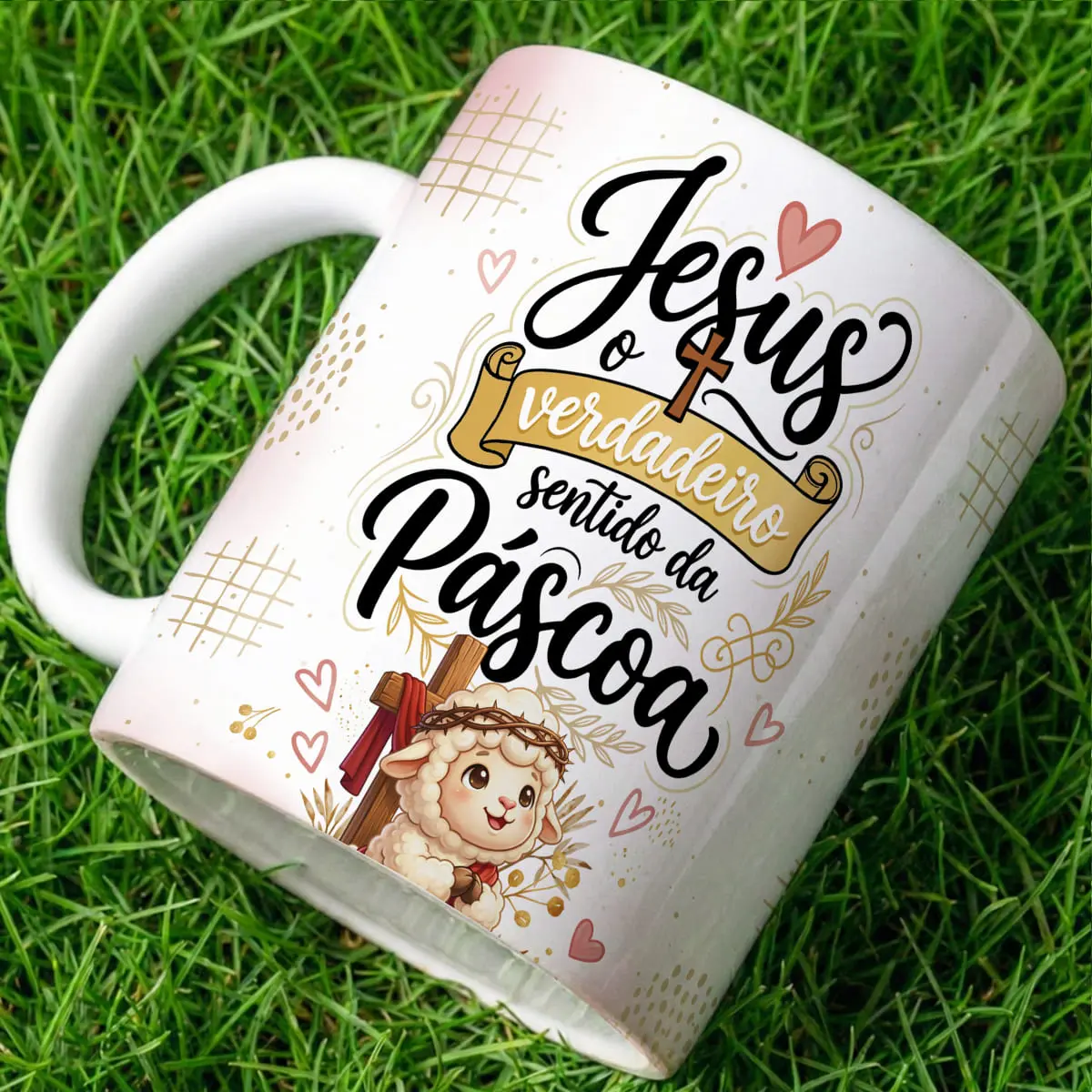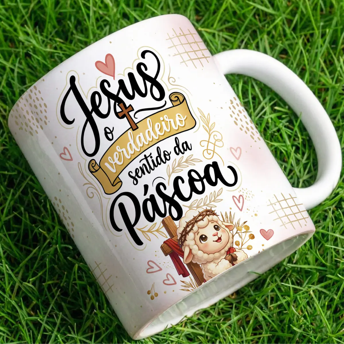 A arte para caneca jesus o verdadeiro sentido da páscoa foi desenvolvida com foco em conexão emocional. A presença do cordeirinho, da cruz e dos elementos delicados cria uma narrativa visual que comunica fé, paz e renovação sem esforço.