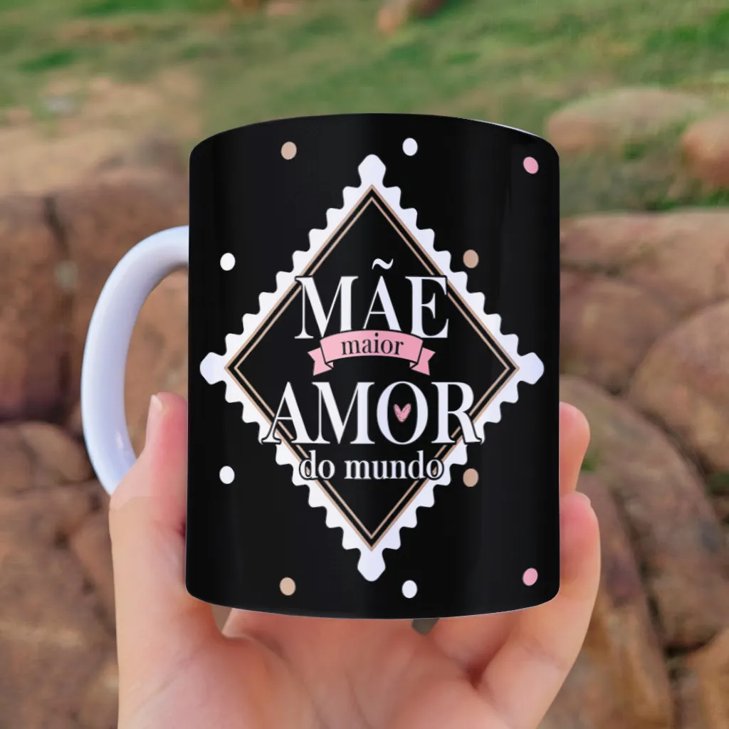 A arte para caneca mãe maior amor do mundo dia das mães foi criada para atender exatamente essa necessidade. Seu design elegante com fundo escuro e detalhes em tons rosados transmite sofisticação e sensibilidade, fugindo das artes comuns que saturam o mercado.
