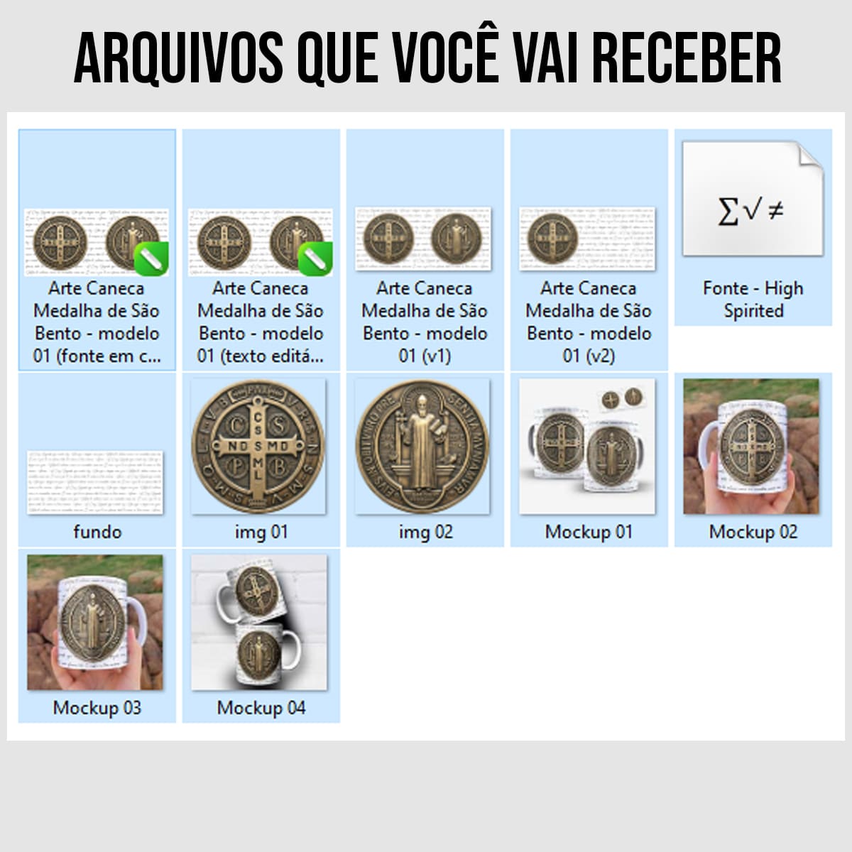 A arte para caneca medalha de são bento oração foi preparada para facilitar o fluxo de trabalho e permitir adaptações sempre que necessário. O arquivo foi organizado de forma que o profissional possa editar o texto do fundo, ajustar elementos ou criar novas variações da estampa a partir dos elementos soltos em PNG.