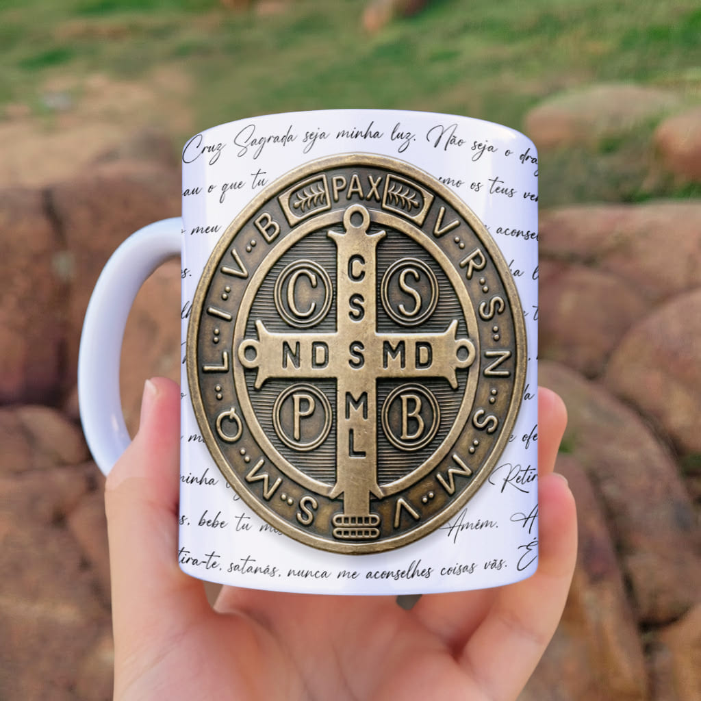 A arte para caneca medalha de são bento oração se encaixa perfeitamente em um dos nichos mais constantes do mercado de personalizados: o religioso. Produtos com símbolos de fé mantêm procura recorrente porque carregam significados que vão além da estética.