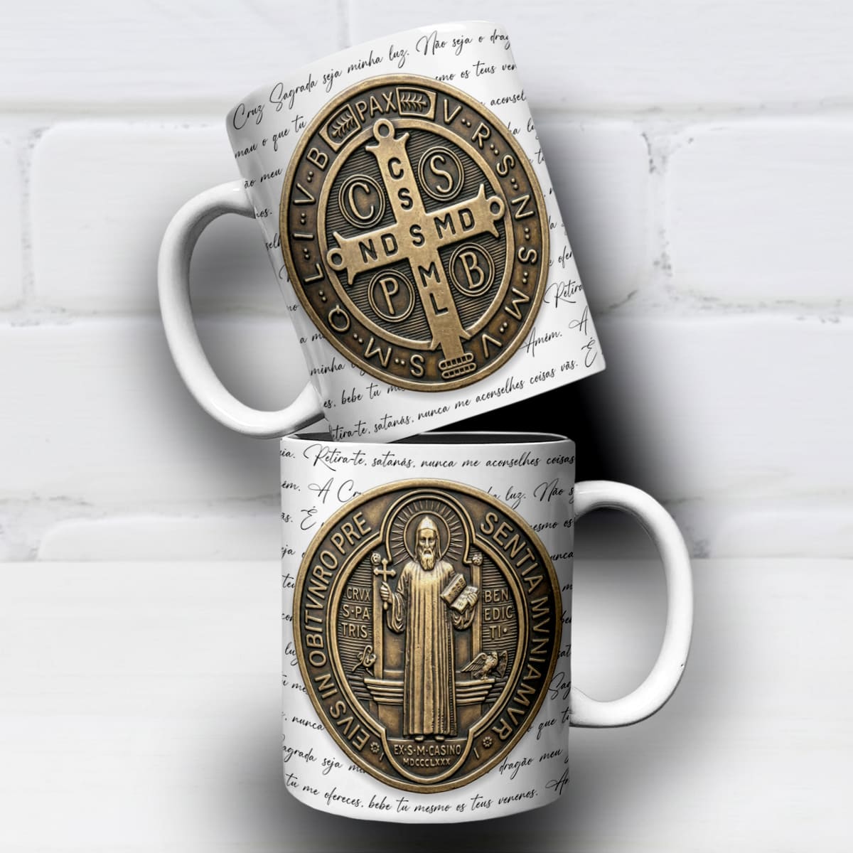 A arte para caneca medalha de são bento oração se encaixa perfeitamente nesse cenário, pois combina um dos símbolos mais conhecidos da tradição cristã com uma estética elegante que se destaca facilmente em vitrines digitais e catálogos.