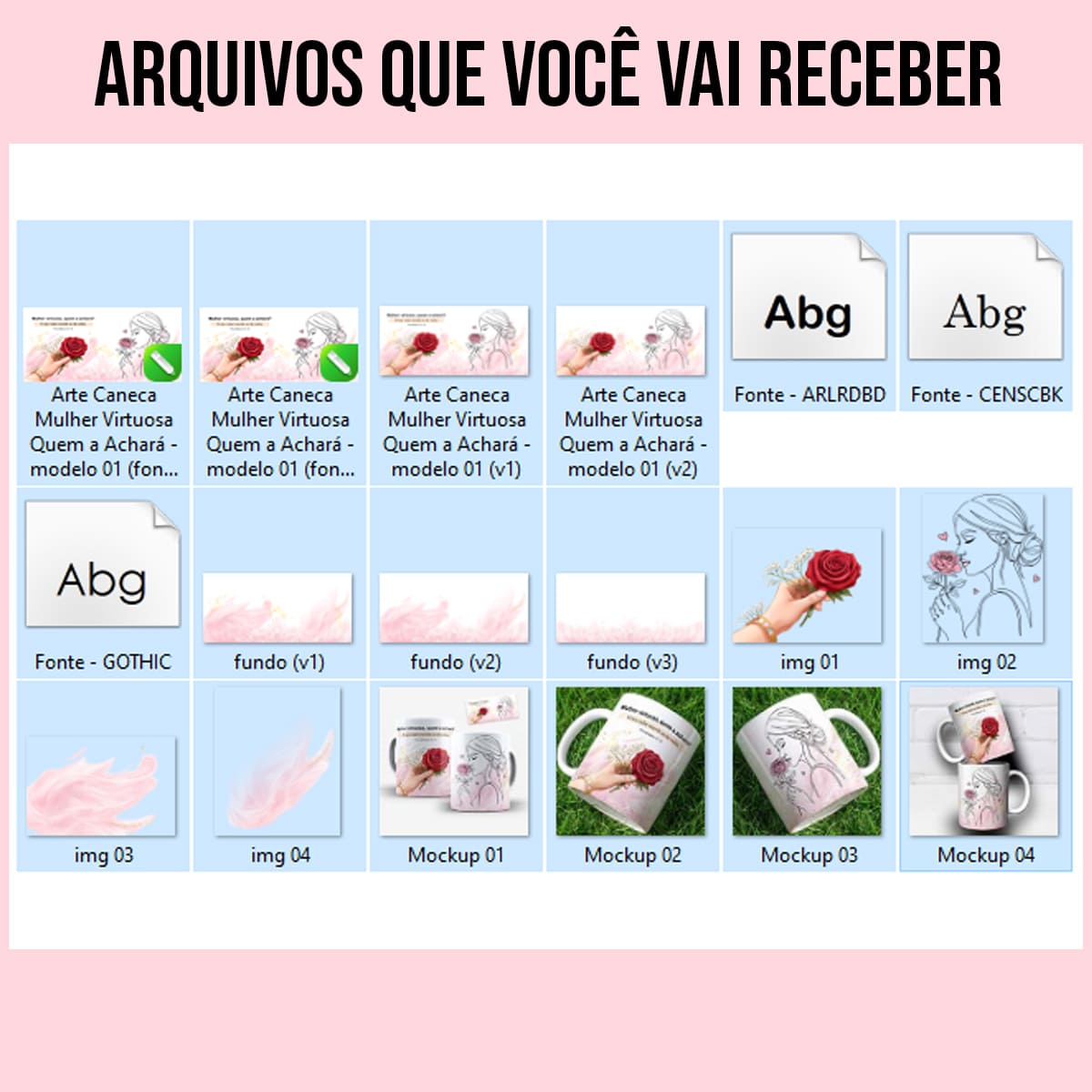 Com a arte para caneca mulher virtuosa quem a achará, você também recebe os elementos separados em PNG. Isso abre espaço para criar kits personalizados, versões com nomes, adaptações para outras datas e até composições exclusivas sob encomenda.