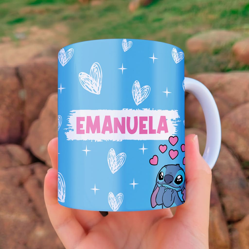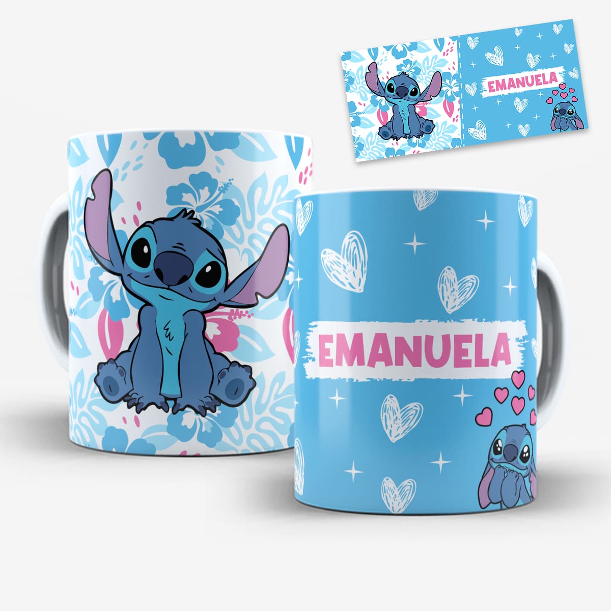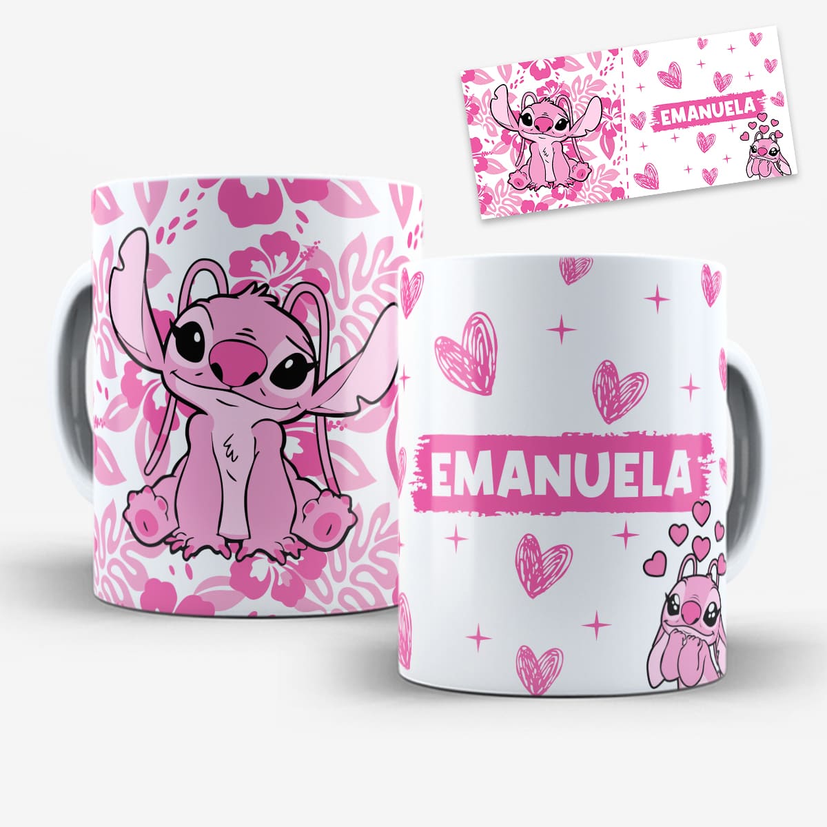 Agora imagine ter no seu portfólio não apenas uma, mas duas artes prontas para caneca com Stitch e Angel, completas com espaço para personalização de nome.