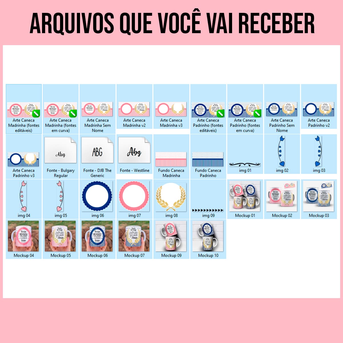 Ao adicionar este item ao seu portfólio, você terá em mãos as duas versões (rosa para madrinha e azul para padrinho), com o espaço ideal para personalizar com o nome da criança.